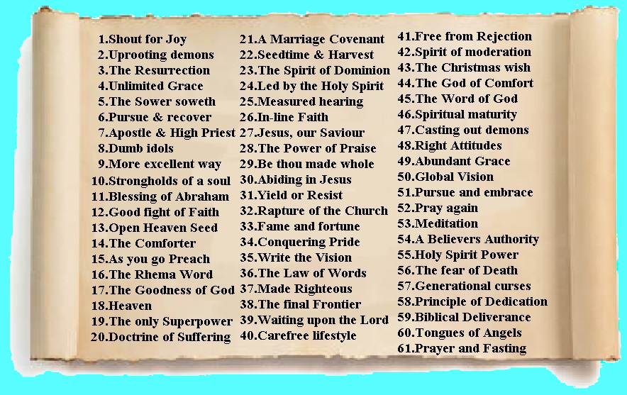 Throughout this series, Rev. Schloegel lets the WORD speak for itself. On each subject, Bible scriptures are simply repeated. When the believer mixes faith with their hearing (Heb.4:2 KJV), the WORD will be planted in the hearer’s heart. Hearing God’s promises creates Faith which brings the desired results! For example, giving the Healing Scriptures audio to someone in the hospital or on their death-bed…if the sick are diligent to “Hear God’s Word” daily, the time will come when they Believe they are Healed (and “rise up”, Isa.53:4-5), moreso than how they feel or look (2 Cor.5:7)! This series will make the WORD of God come alive in your spirit! Not just a form of Godliness, but with the Power thereof, 2 Tim.3:5-7! Note: This Series (listed below) may be listened to, on our YT Channel! You are free to convert it to mp3, and make your own copies..only for sharing!